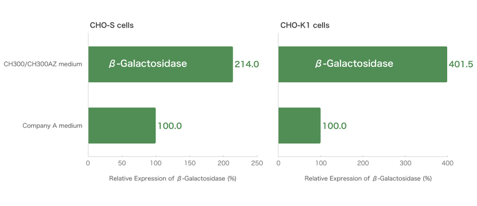CH300/CH300AZ培地は、他社 無血清培地と同様に、良好なパフォーマンスで、組換えタンパク質の生産を発揮できます。