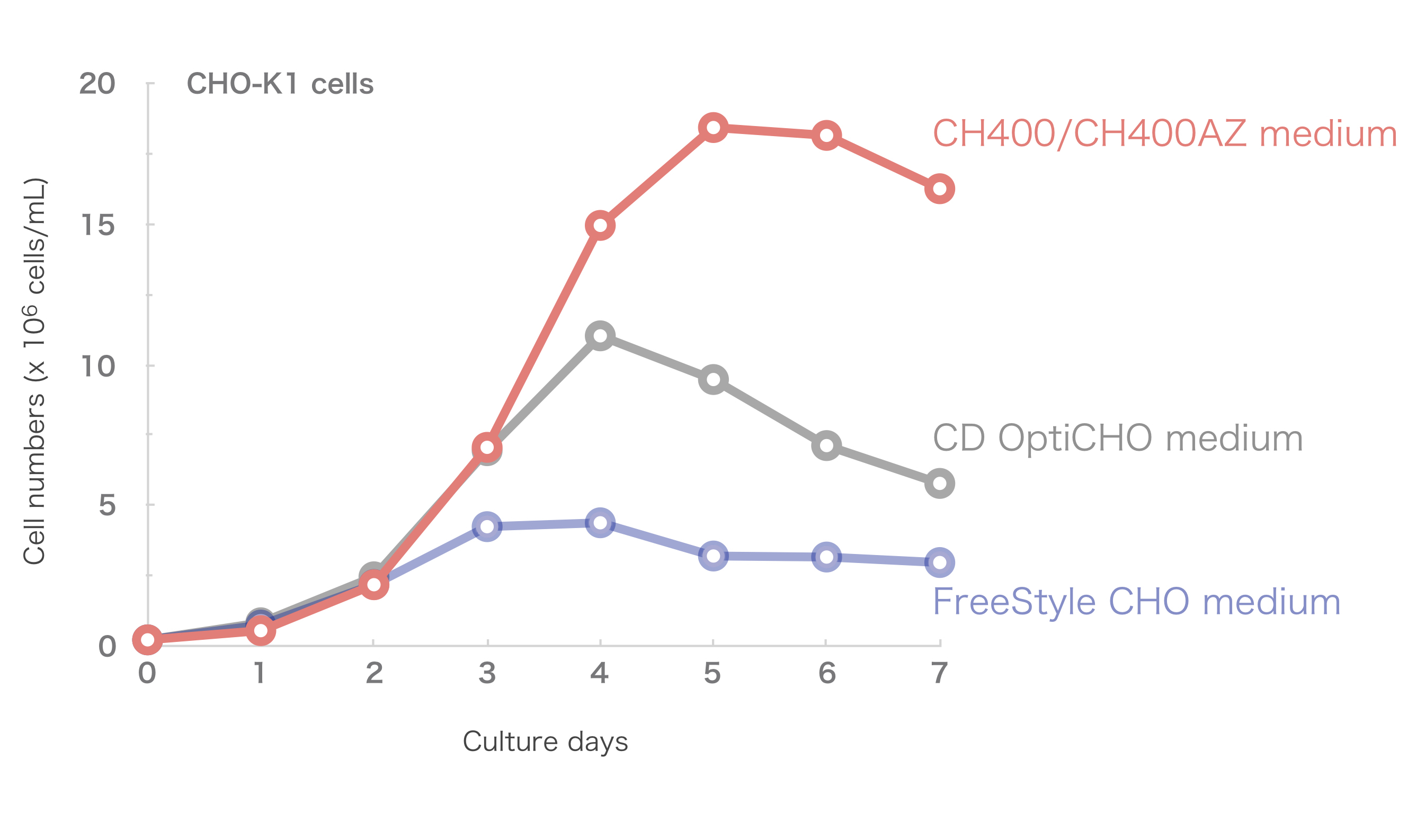 CH400/CH400AZ培地は、Thermo社 CD OptiCHO medium 等と同様に、CHO-K1細胞の良好な細胞増殖を導きます。