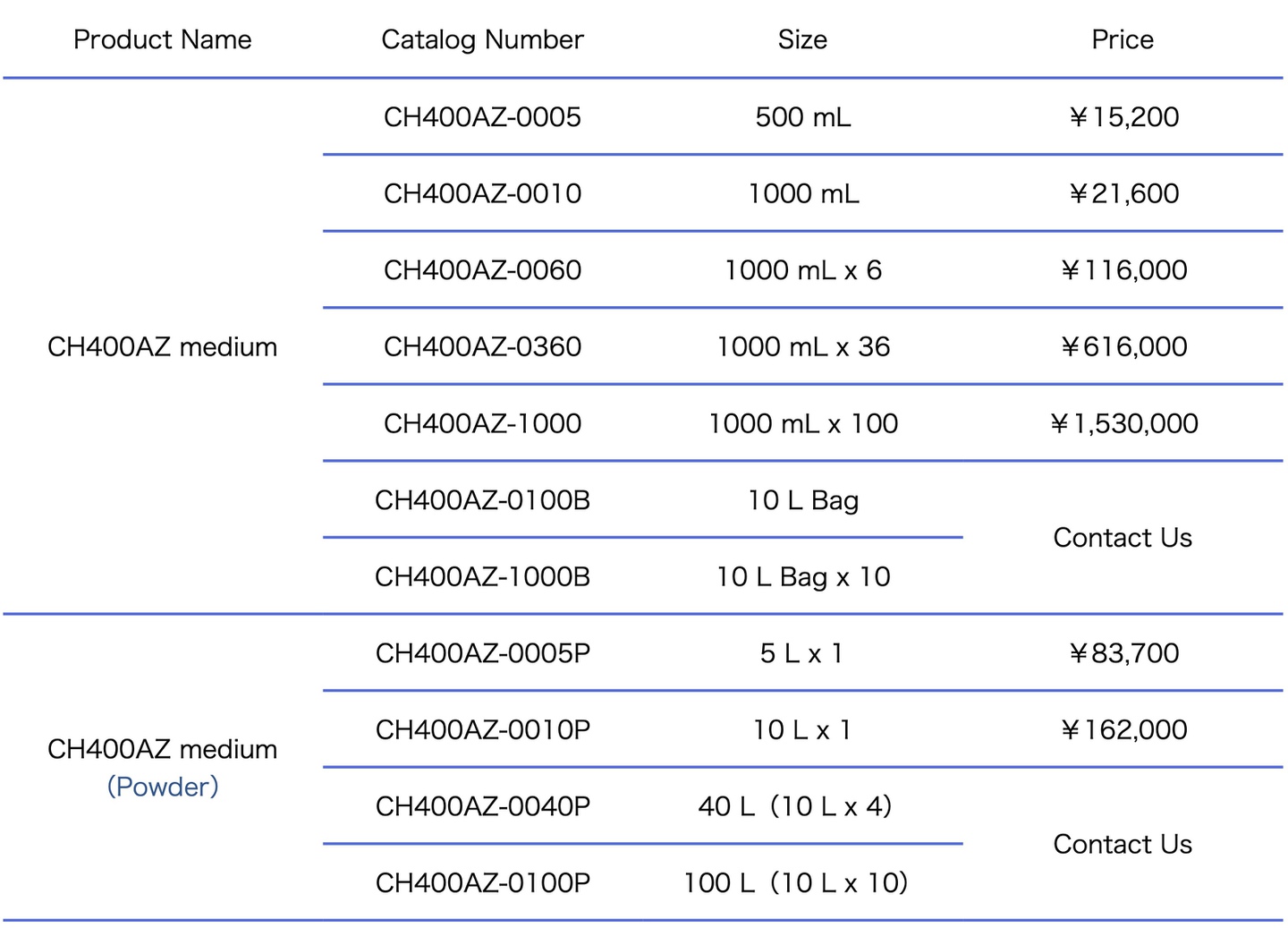 CH400AZ medium is a chemically defined medium / serum-free medium optimized for the high production of recombinant proteins in Chinese hamster ovary (CHO) cells, such as CHO-K1, CHO-S, DG44, and DXB11 cells. The medium contains no proteins, hydrolysates, or human/animal-derived components. All components have a known chemical structure.
