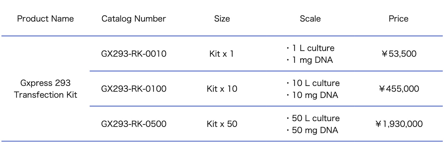 Gxpress 293 Transfection Kit has been developed for the gene expression system of human embryonic kidney (HEK) 293 cells, such as Expi293F or HEK293 cells, and the high production of recombinant proteins or the transfection assay in serum-free culture. All contents of Gxpress 293 Transfection Kit are a chemically defined composition that no contains serum, protein, animal origin, hydrolysates, and no unknown composition.