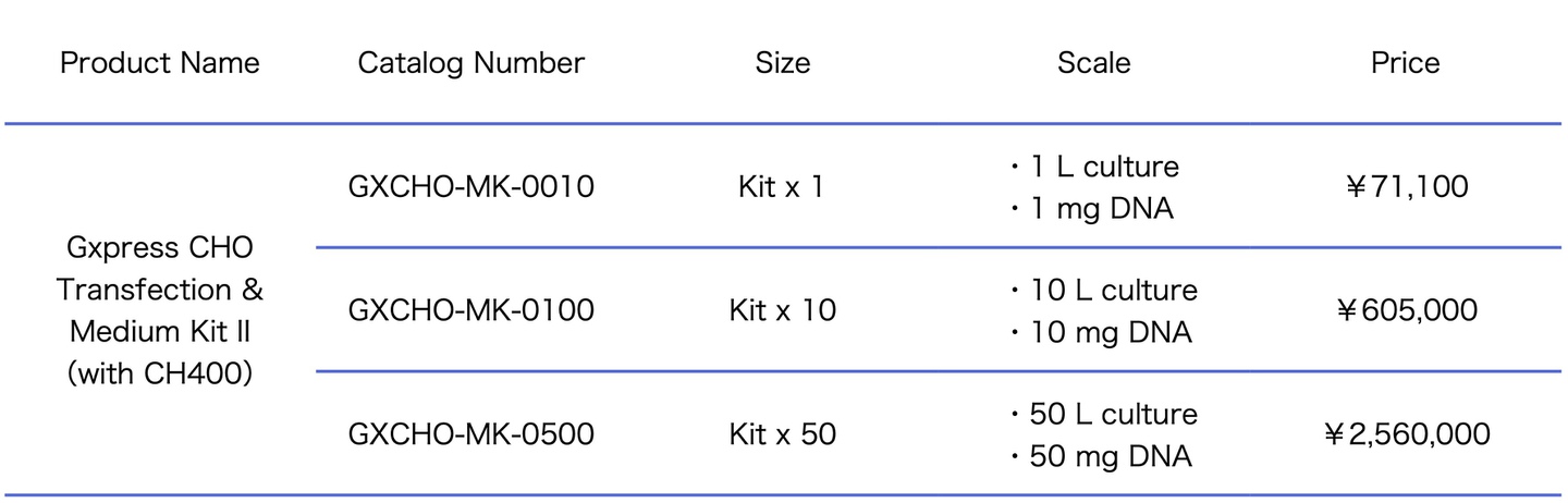 Gxpress CHO Transfection & Medium Kit II has been developed for the gene expression system of Chinese hamster overy (CHO) cells, such as CHO-K1 or CHO-S cells, and the high production of recombinant proteins or the transfection assay in serum-free culture. All contents of Gxpress CHO Transfection & Medium Kit are a chemically defined composition that no contains serum, protein, animal origin, hydrolysates, and no unknown composition.