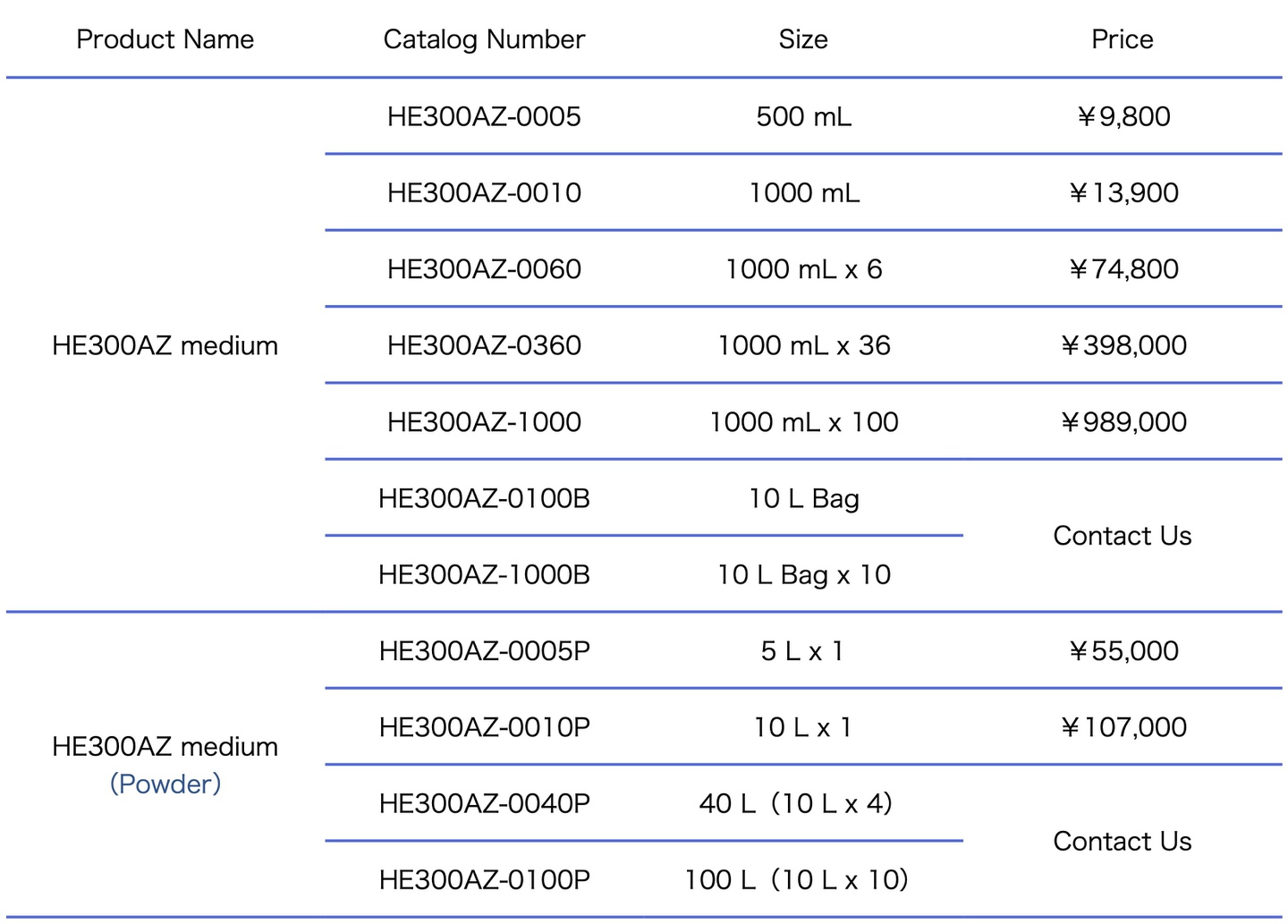 HE300AZ medium is a chemically defined medium / serum-free medium optimized for the high production of recombinant proteins in human embryonic kidney (HEK) 293 cells, such as Expi293F, 293-F, HEK293, 293T, VPC cells. The medium contains no proteins, hydrolysates, or human/animal-derived components. All components have a known chemical structure.