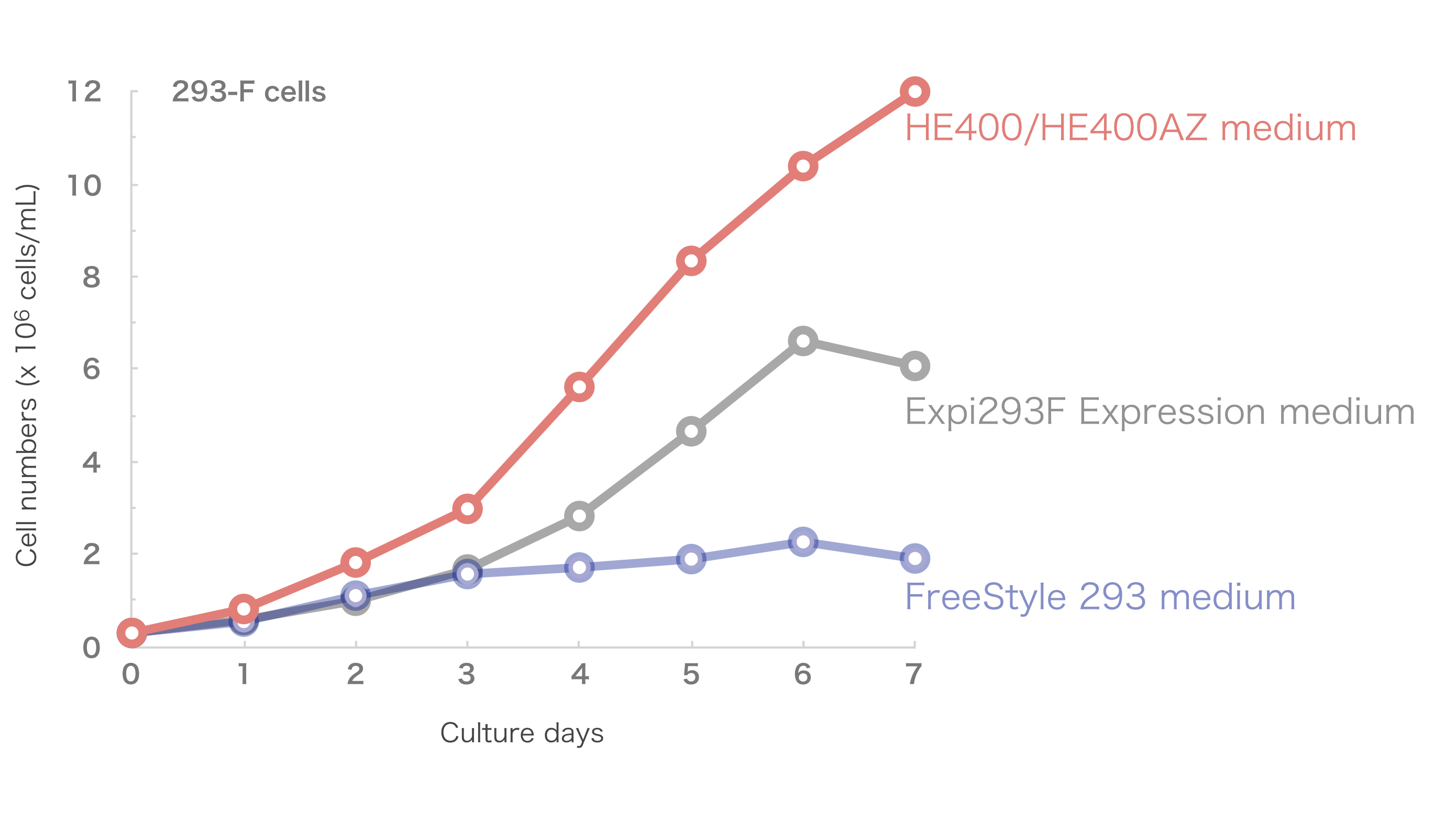 HE400/HE400AZ medium leads to the high performance similar to Thermo Expi293 Expression medium in cell growth for 293-F cells.