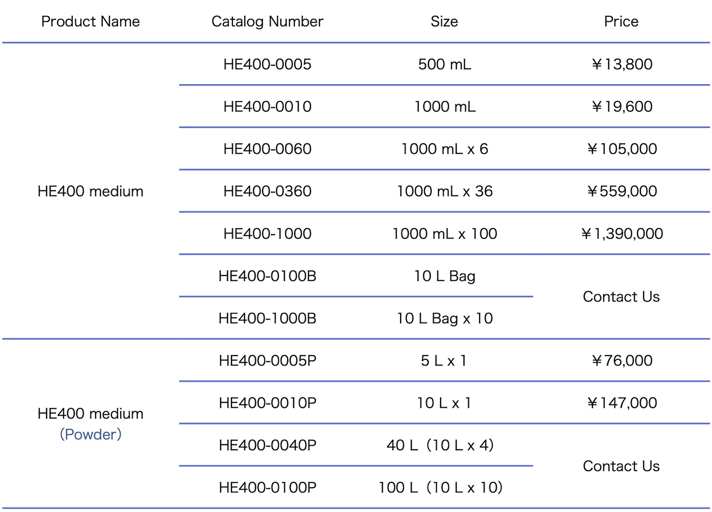 HE400 medium is a chemically defined medium / serum-free medium optimized for the high production of recombinant proteins in human embryonic kidney (HEK) 293 cells, such as Expi293F, 293-F, HEK293, 293T, VPC cells. The medium contains no proteins, hydrolysates, or human/animal-derived components. All components have a known chemical structure.
