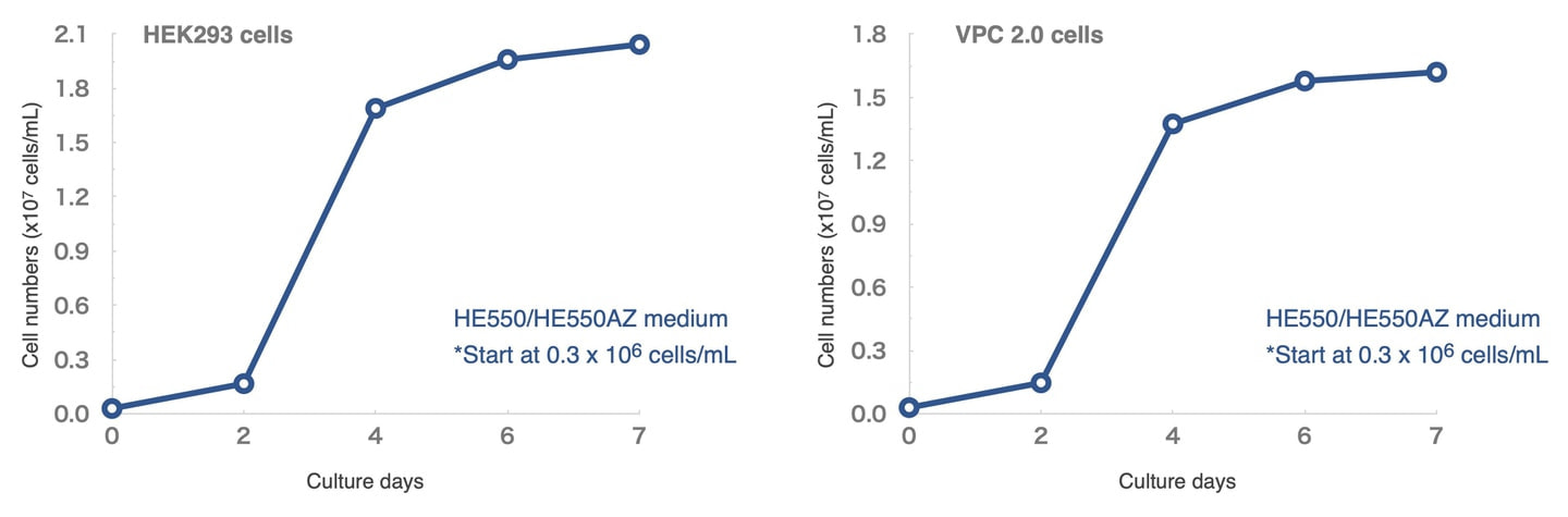 HE550/HE550AZ medium supports efficient cell proliferation of Expi293F Pro cells, comparable to Expi293 Pro Expression medium from Thermo Fisher Scientific.