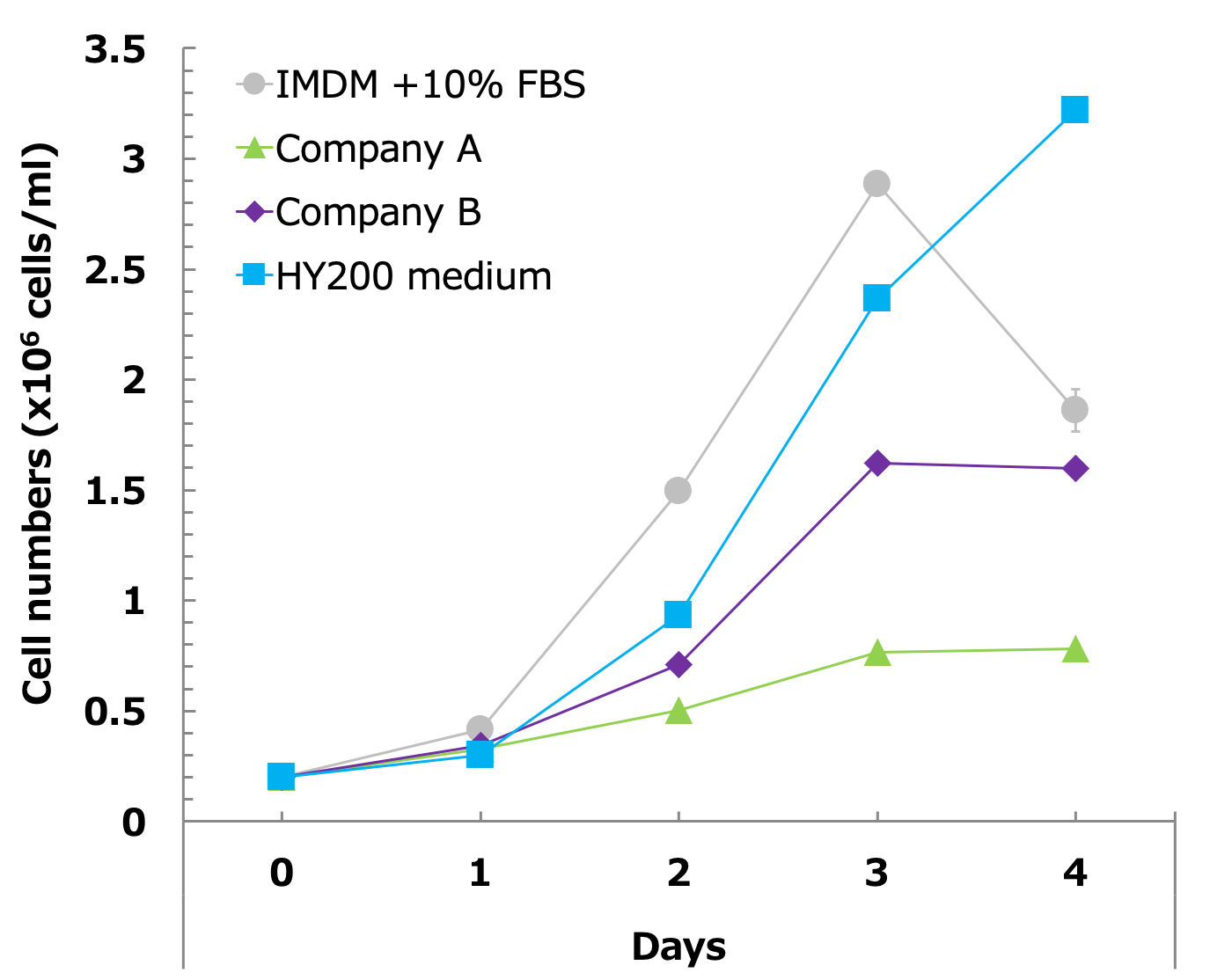 Mouse hybridoma 9E10 cells subcultured in IMDM with 10% FBS were directly inoculated at 2.0 x 10e5 cells/mL and incubated into HY200 medium (5 mL with 4 mM Gln), IMDM with 10% FBS (5 mL), or other commercial media (5 mL with 4 mM Gln) in T25 flasks at 37℃ and 5% CO2.