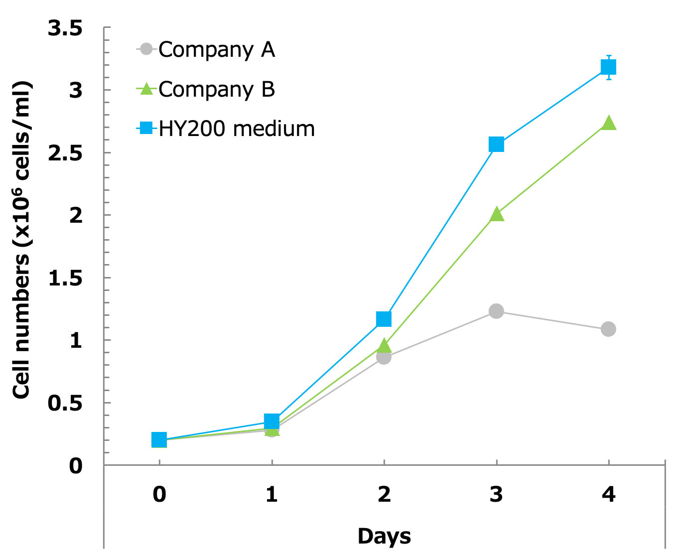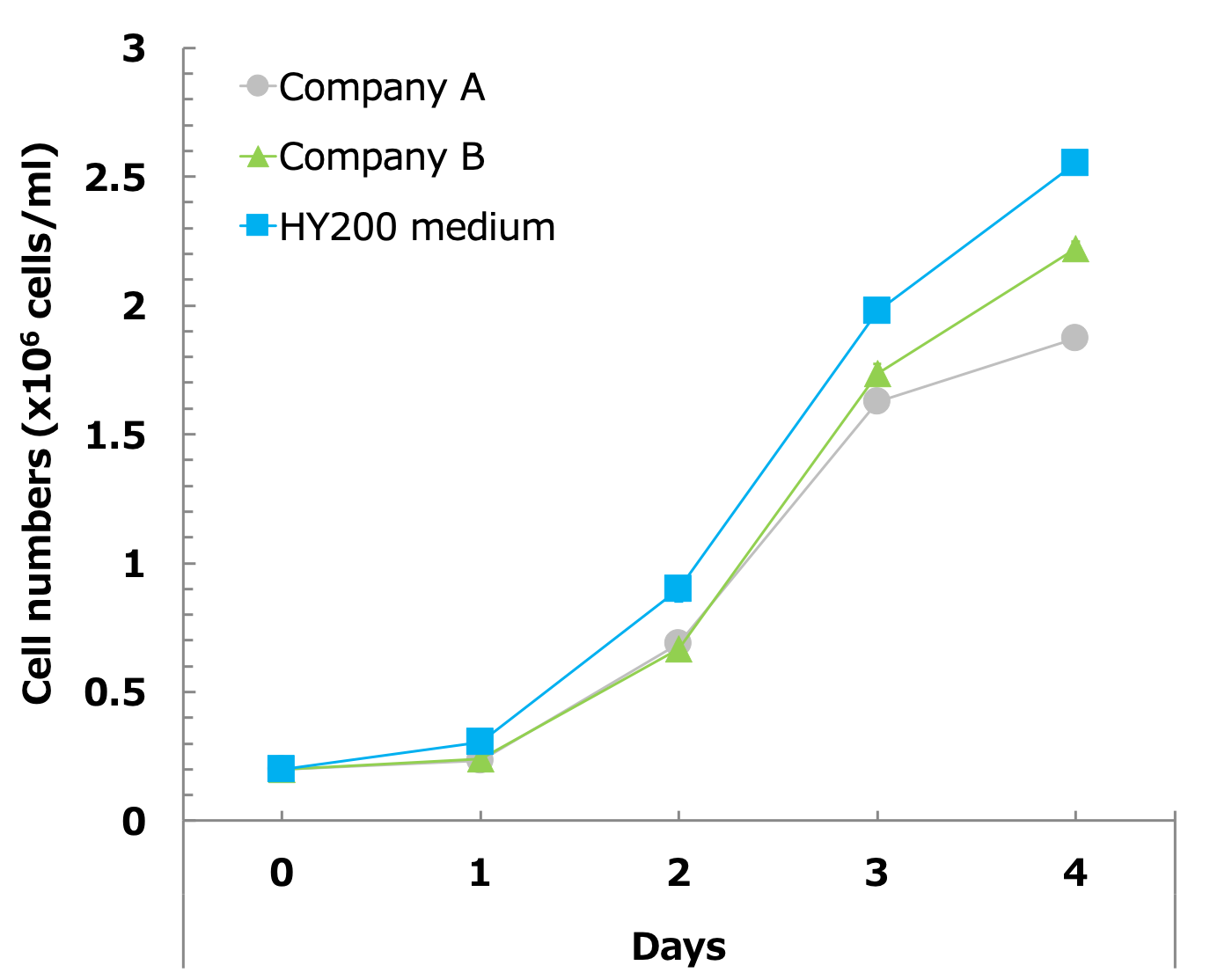 Mouse hybridoma 9E10 cells subcultured in HY300 medium were inoculated at 2.0 x 10e5 cells/mL and incubated into HY200 medium (5 mL with 4 mM Gln) or other commercial media (5 mL with 4 mM Gln) in T25 flasks at 37℃ and 5% CO2.