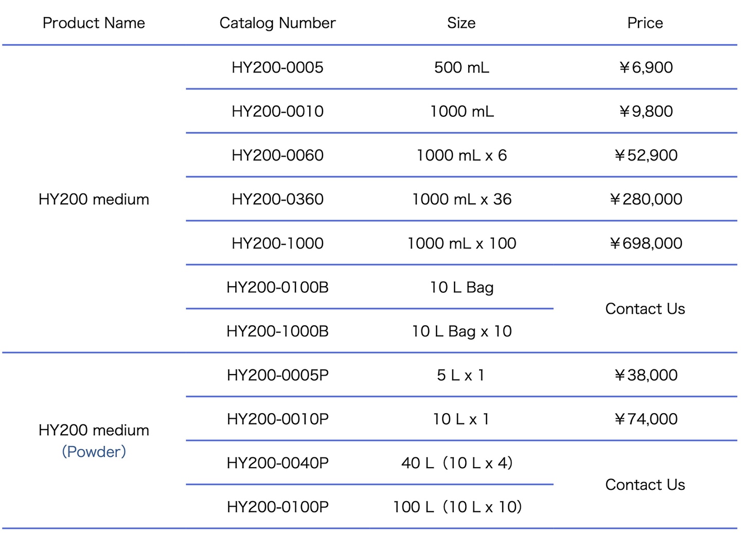 HY200 medium is a chemically defined medium / serum-free medium optimized for the growth and antibody production of hybridoma or myeloma in serum-free culture. The medium contains no proteins, hydrolysates, or human/animal-derived components. All components have a known chemical structure.