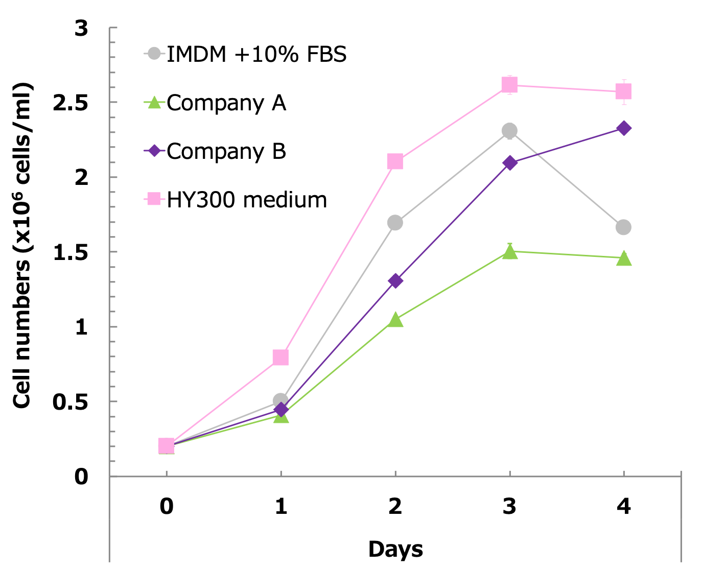 Mouse hybridoma 9E10 cells subcultured in IMDM with 10% FBS were directly inoculated at 2.0 x 10e5 cells/mL and incubated into HY300 medium (5 mL with 4 mM Gln), IMDM with 10% FBS (5 mL), or other commercial media (5 mL with 4 mM Gln) in T25 flasks at 37℃ and 5% CO2.