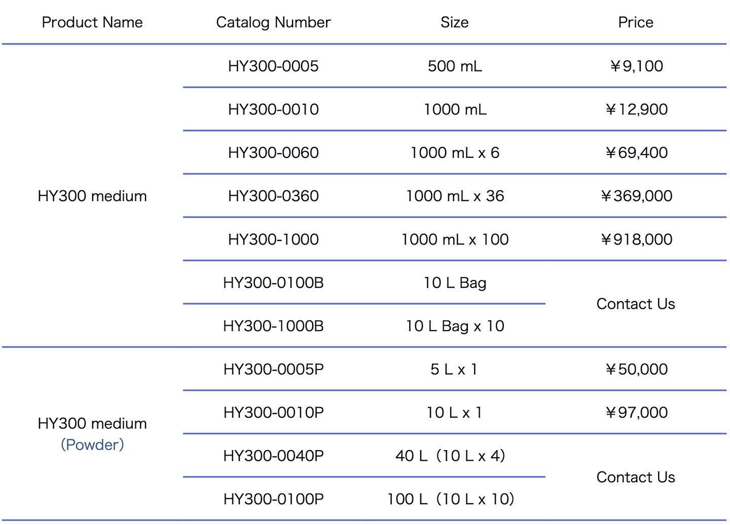 HY300 medium is a chemically defined medium / serum-free medium optimized for the growth and antibody production of hybridoma or myeloma in serum-free culture. The medium contains phenol red, but no proteins, hydrolysates, or human/animal-derived components. All components have a known chemical structure.
