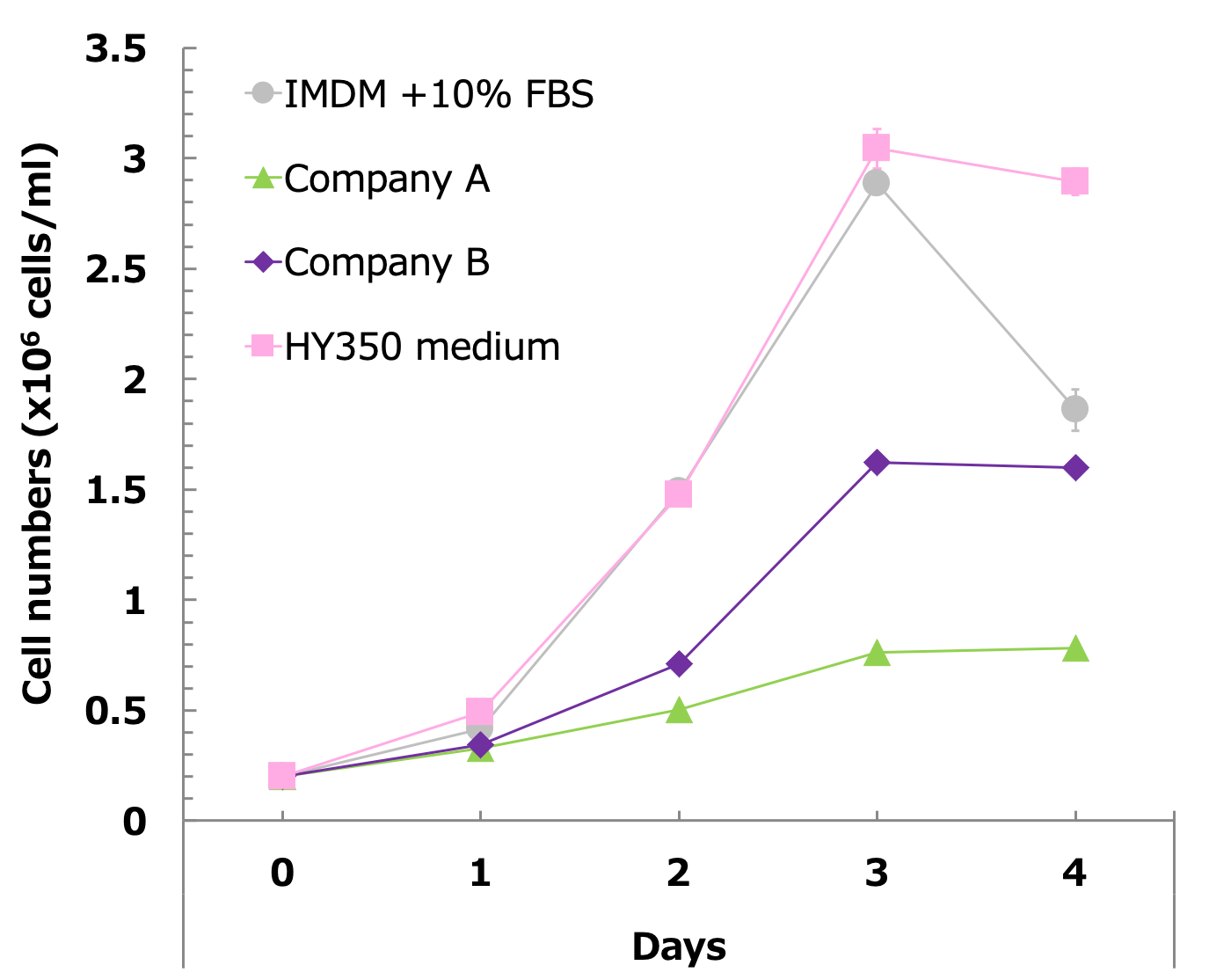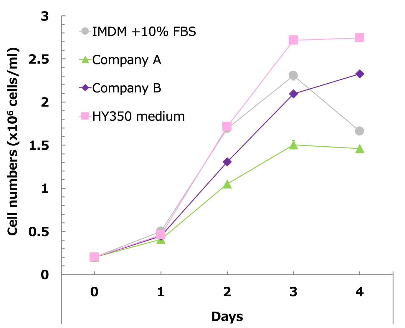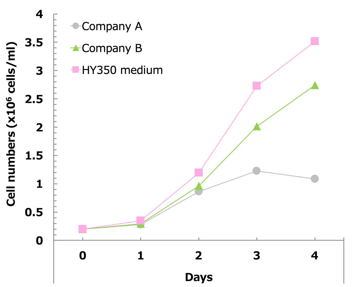 Mouse hybridoma 9E10 cells subcultured in IMDM with 10% FBS were directly inoculated at 2.0 x 10e5 cells/mL and incubated into HY350 medium (5 mL with 4 mM Gln), IMDM with 10% FBS (5 mL), or other commercial media (5 mL with 4 mM Gln) in T25 flasks at 37℃ and 5% CO2.