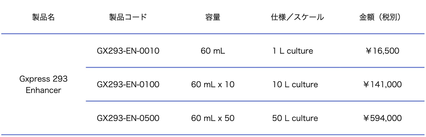 Gxpress 293 Enhancer は、ヒト由来HEK293細胞(例;Expi293F、293-F、HEK293、293T、VPC等)を使用した、抗体医薬などの組換えタンパク質や遺伝子治療用のウイルスベクターなどの高効率生産のためにデザインされた、化学的に成分が明らかなエンハンサー試薬です。