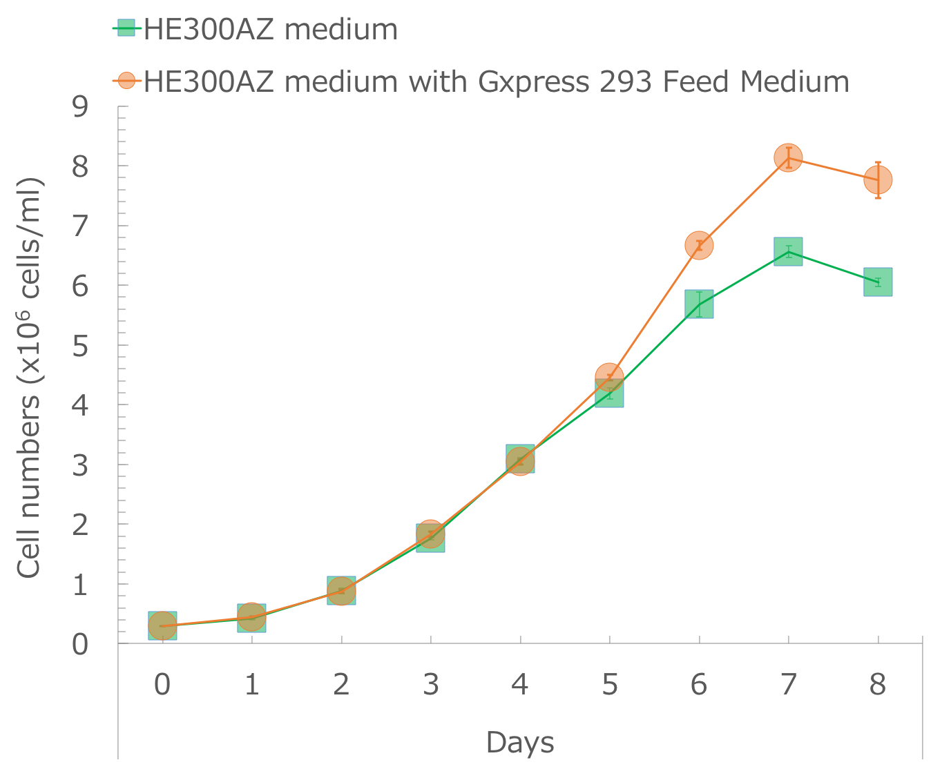 Fig. 2) Growth rate of 293T cells in HE300AZ medium with Gxpress 293 Feed medium.