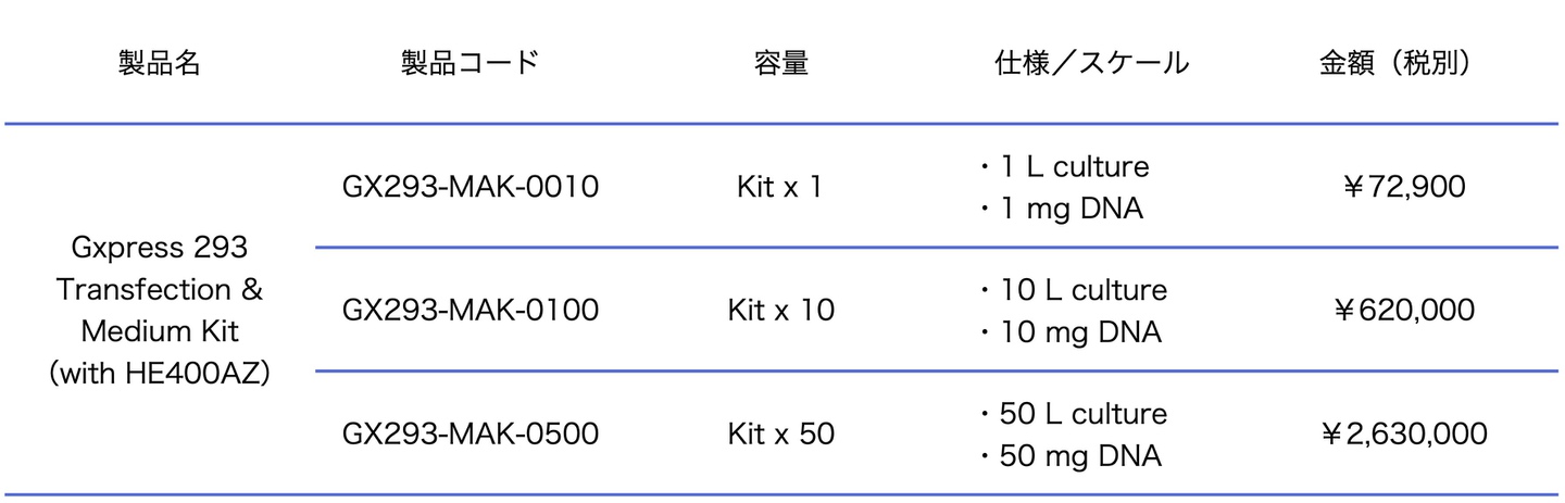 Gxpress 293 Transfection & Medium Kit は、ヒト由来HEK293細胞(例;Expi293F、293-F、HEK293、293T、VPC等)を使用した、抗体医薬などの組換えタンパク質や遺伝子治療用のウイルスベクターなどの生産システムのためにデザインされた、化学的に成分が明らかなトランスフェクションキットです。