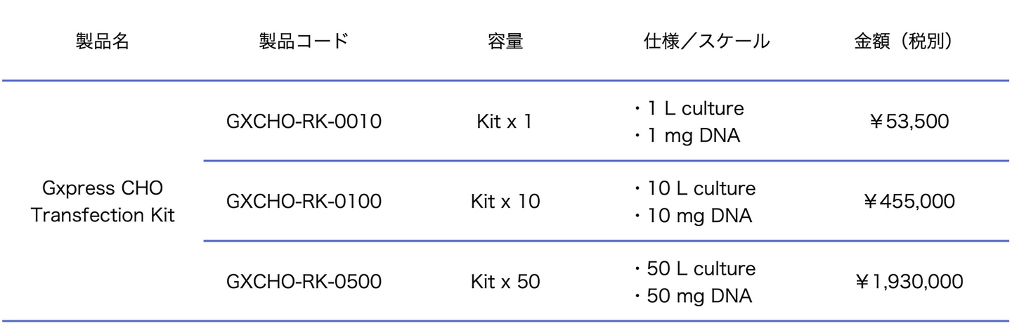 Gxpress CHO Transfection Kit は、チャイニーズハムスター由来CHO細胞(例;CHO-K1細胞、CHO-S細胞、DG44細胞、DXB11細胞等)を使用した、抗体医薬などの組換えタンパク質の高生産システムのためにデザインされた、化学的に成分が明らかなトランスフェクションキットです。