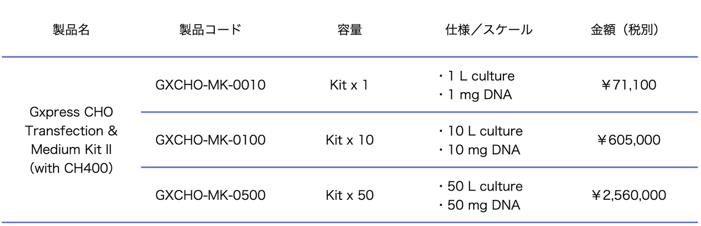 Gxpress CHO Transfection & Medium Kit II は、チャイニーズハムスター由来CHO細胞(例;CHO-K1細胞、CHO-S細胞、DG44細胞、DXB11細胞等)を使用した、抗体医薬などの組換えタンパク質の高生産システムのためにデザインされた、化学的に成分が明らかなトランスフェクションキットです。
