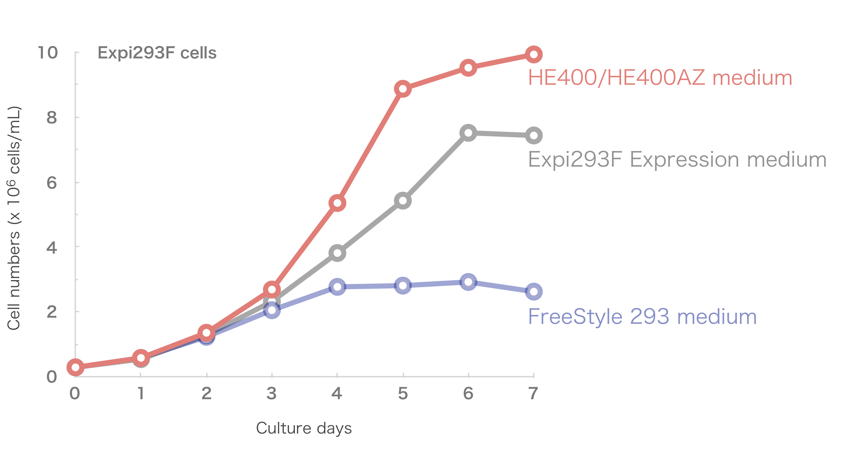 HE400/HE400AZ培地は、Thermo社 Expi293 Expression medium と同様に、293-F細胞の良好な細胞増殖を導きます。