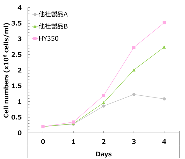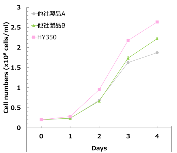 無血清培地(当社;HY300)で100日間 継代培養したマウス由来ハイブリドーマ(9E10細胞)を、HY350培地(5 mL with 4 mM Gln)、市販培地(5 mL with 4 mM Gln)を加えたT25フラスコ(6 mL)に播種して、以下の条件で静置培養した。
