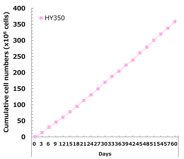 血清培地(IMDM with 10% FBS)で継代培養したミエローマ NS0細胞を、HY350での低血清条件(1% → 0.2%のシークエンシャルアダプテーション)で順応させた後、HY350培地(20 mL with 4 mM Gln)を加えた100 mm ディスポーザブルディシュ(20 mL)に播種して、以下の条件で、60日間静置培養した。継代は、3日間ごとに新しい培地に細胞を播種して行った。